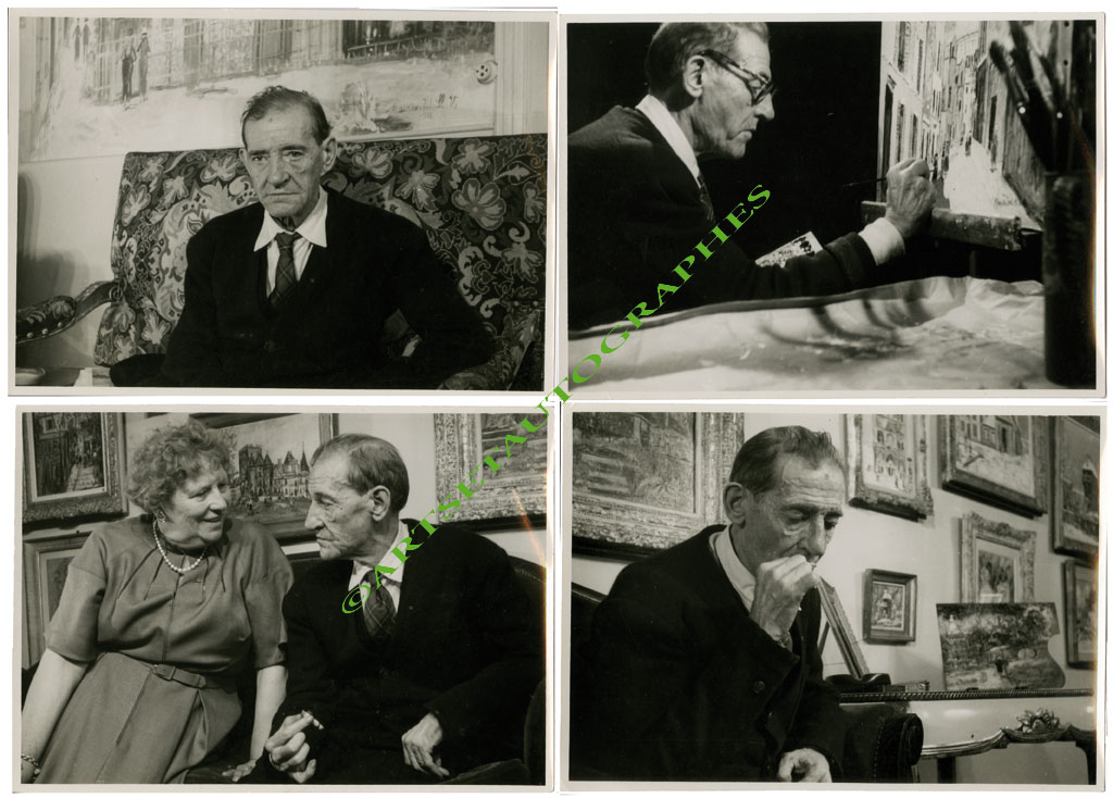 PhotographiesEnsemble de 4 photographies représentant le peintre et son épouse autour de ses tableaux. 175 X 125 mm. Une des photographies représente le peintre en train de peindre. Beaux plans rapprochés. Rare.