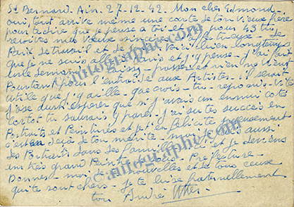 Carte autographe signéeCarte autographe signée, adressée au peintre Edmond Heuzé. Saint-Bernard-Ain, le 27 décembre 1942 ; 145 x 105 mm, adresse au dos. « Oui, tout arrive, même une carte de ton vieux frère pour te dire que je pense à toi et que pour 43...