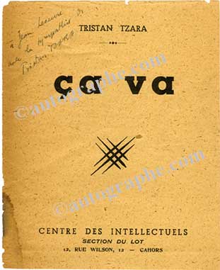 Ça va« Ça va ». Centre des Intellectuels, Cahors, [1943] ; in-16 (110 X 135 mm), 12 pages, agrafé tache au niveau de l’agrafe). Édition originale sur papier courant imprimée à petit nombre, il n’a été tiré que 15 pur fil en grands...