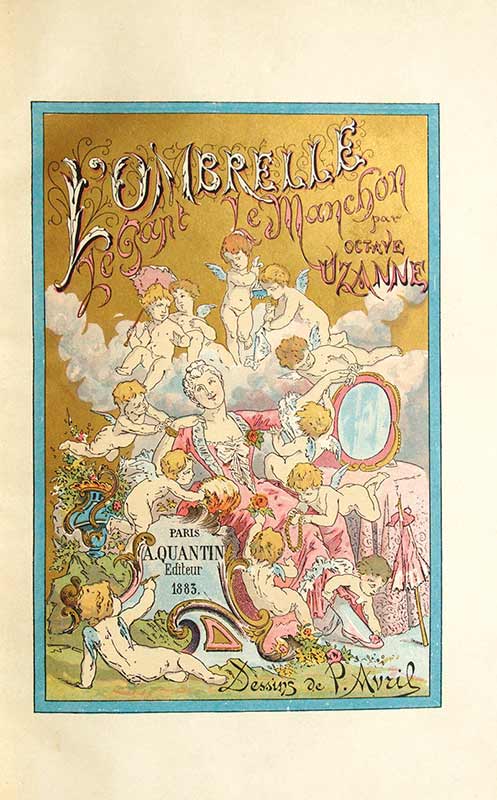 « L’OMBRELLE, LE GANT, LE MANCHON »« L’OMBRELLE, LE GANT, LE MANCHON ». Illustrations en couleurs de Paul Avril. Paris, Quantin, 1883 ; in-4°. Relié demi-maroquin bleu sombre à coins (reliure de Pierson), titre doré, tranches dorées, couverture en couleur...