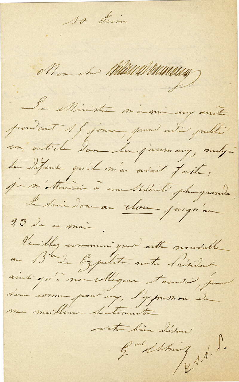 Lettre autographe signéeLettre autographe signée. « 10 juin » ; 1 page 1/2 in-8°. « Le ministre m’a mis aux arrêts pendant 15 jours pour avoir publié un article dans les journaux, malgré la défense qu’il m’en avait faite : je m’attendais à une...