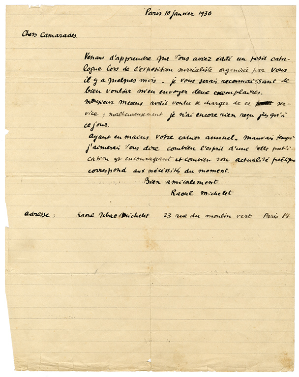 Lettre autographe signéeLettre autographe signée « Raoul Michelet », adressée aux « Chers Camarades » [du Groupe Mauvais Temps]. Paris, 10 janvier 1936 ; 3/4 page in-4°, fentes aux plis, restaurée.« Venant d'apprendre que vous aviez édité un petit...