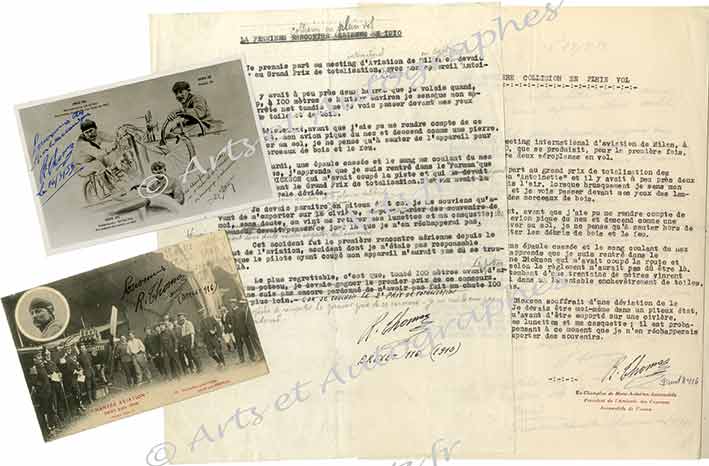 Ensemble d’1 lettre autographe signée et d’1 pièce signée :Ensemble d’1 lettre autographe signée et d’1 pièce signée :— Pièce signée. Sans date ; 1 page in-4°. Récit de la première collision de deux aéroplanes dans lequel il est impliqué: « C’est au meeting international...
