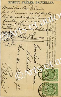Carte autographe signéeCarte autographe signée, au dos de sa photographie, adressée à Joseph Debroux. 4 janvier 1908 ; 1/2 page in-16. « Merci mon cher Debroux pour l’envoi de vos sonates qui m’intéressent vivement. »