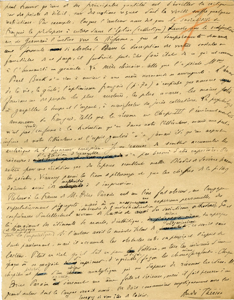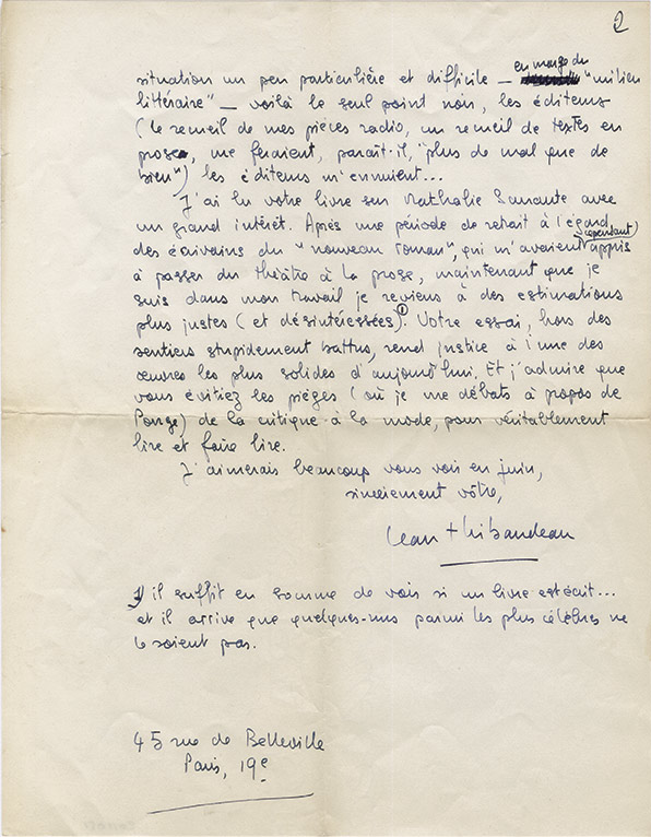 Lettre autographe signéeLettre autographe signée, adressée au philosophe Yvon Bélaval. Paris, le 9 avril 1965 ; 2 pages in-4°. Intéressante lettre littéraire : « Votre lettre d'Amérique (je ne savais pas que vous êtes là-bas) m'a fait vraiment plaisir....