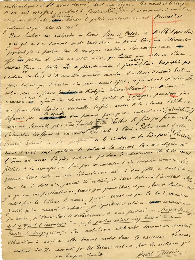 Manuscrit autographe signéManuscrit autographe signé « Les livres ». [1936] ; 6 pages in-4°. Article de critique littéraire pour sa chronique Les livres dans le journal Le Temps.Il évoque les dernières parutions : Georges Bernanos : Journal d’un curé de...