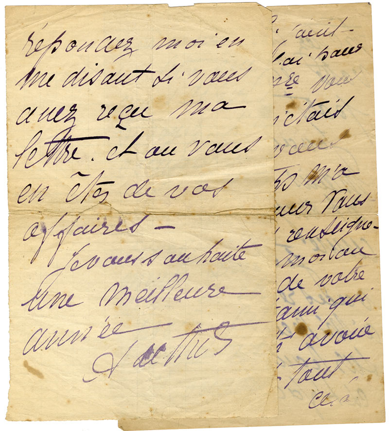 Lettre autgraphe signéeLettre autographe signée, adressée à M. Dettelbach. « Samedi soir » [décembre] ; 2 pages in-8°. En-tête manuscrit du 29 avenue Wagram. ...