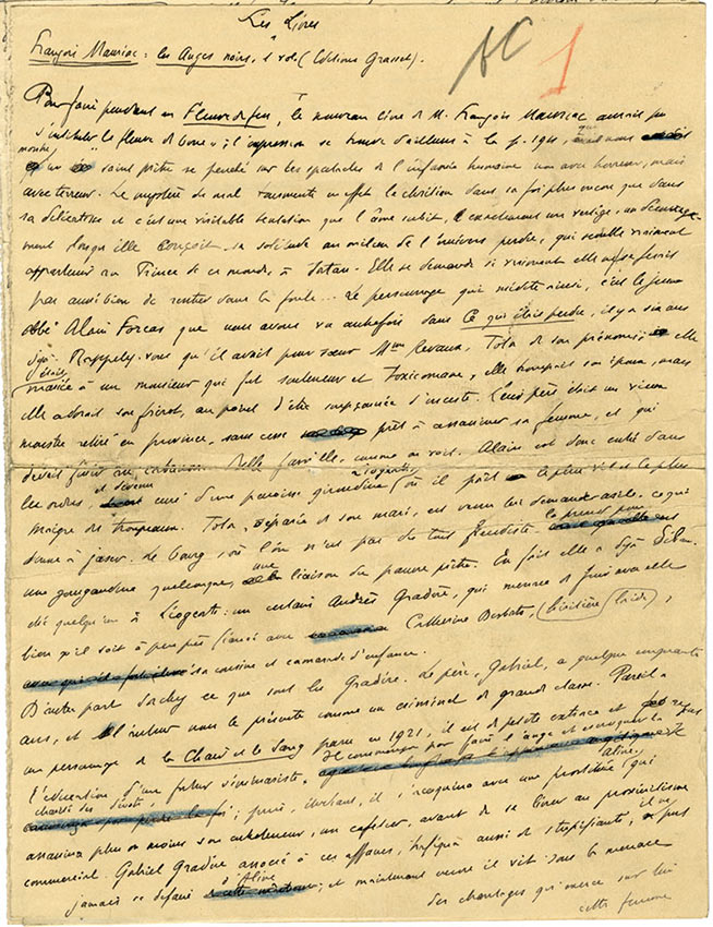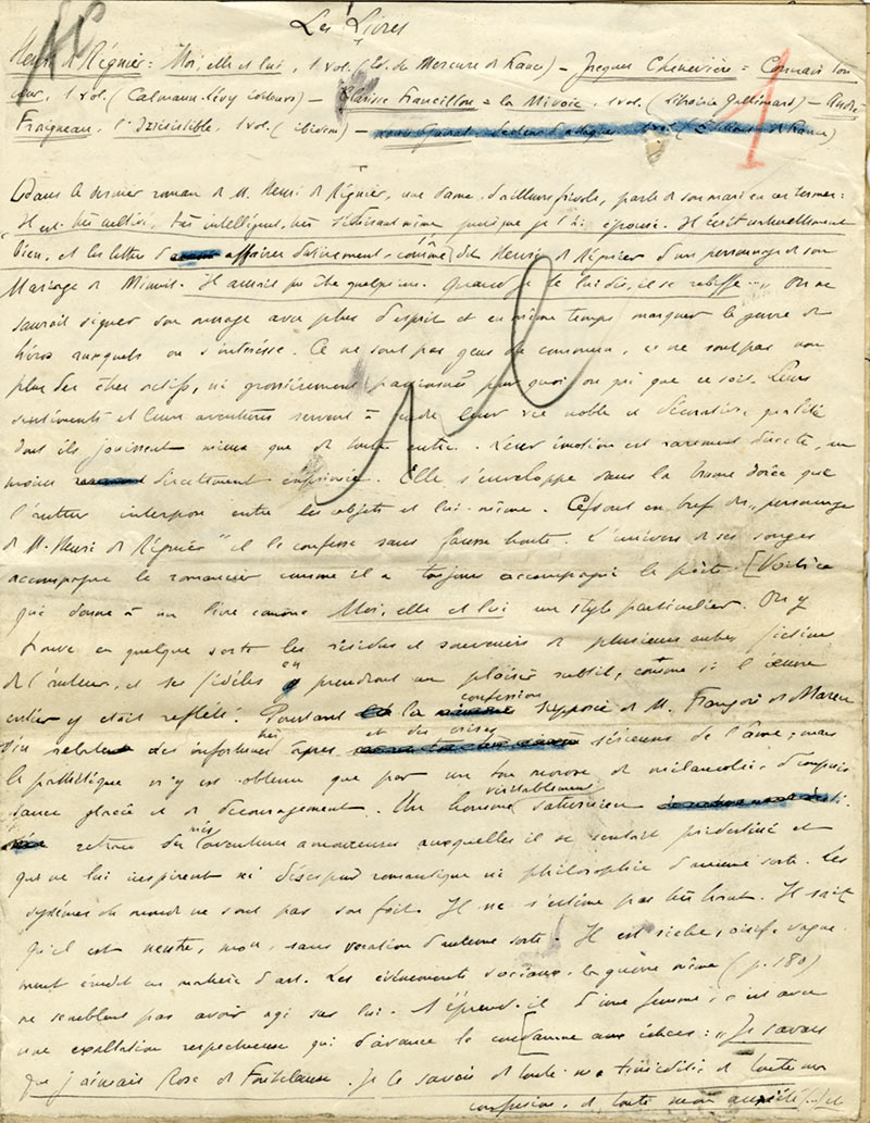 Manuscrit autographe signéManuscrit autographe signé « Les livres ». [1936] ; 7 pages in-4° (fente à la première page). Article de critique littéraire pour sa chronique Les livres dans le journal Le Temps.Cet article est entièrement consacré à François...