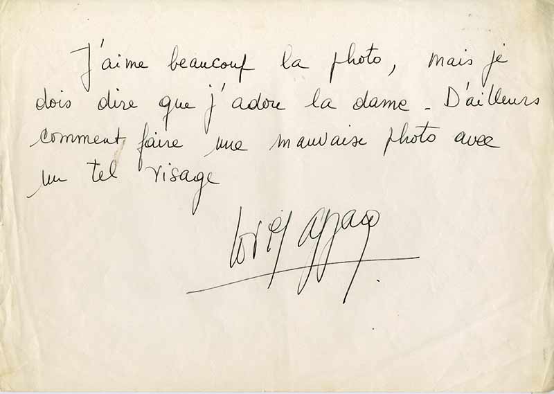 Pièce autographe signéePièce autographe signée. Sans date ; 1 page in-4° oblongue. Texte écrit pour la photographie de Marie Laforêt par Bruno de Mones.« J’aime beaucoup la photo, mais je dois dire que j’adore la dame. D’ailleurs comment faire une...
