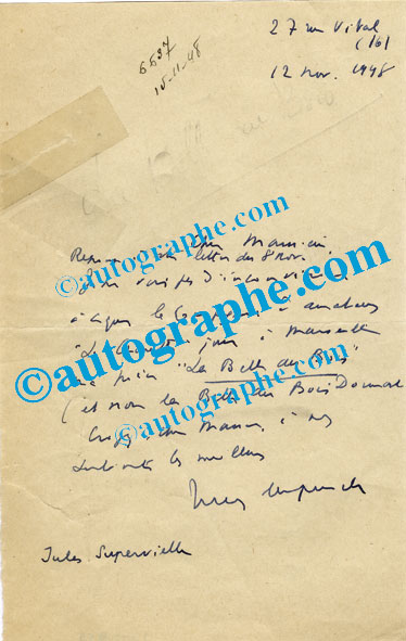Lettre autographe signéeLettre autographe signée. Paris, 12 novembre 1948 ; 1 page in-8°, trace de consolidation avec du scotch invisible. « Je ne vois pas d’inconvénient à ce que la compagnie d’amateurs Le Chouette joue à Marseille ma pièce La Belle...