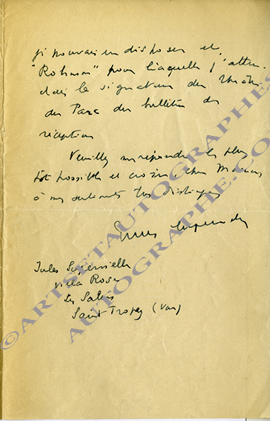 Lettre autographe signéeLettre autographe signée, adressée M. Leclair. Paris, 12 août 1950 ; 1 page in-4°. ...