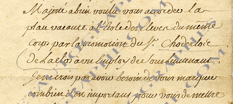 Pièce signéePièce signée par le marquis Cremilles informant, M. Pelletier de Gatigny, de sa nomination à l’École de la Fère en remplacement de Choderlos de Laclos qui a été nommé sous-lieutenant. Versailles, 8 mars 1761 ; 1 page 1/2...