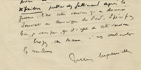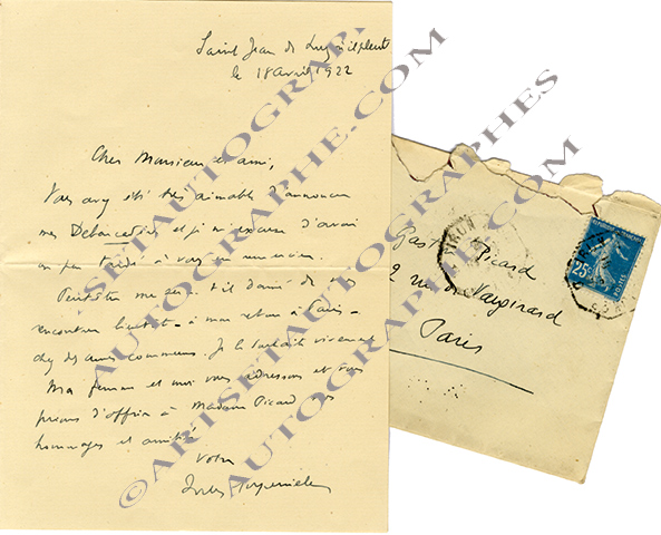 Lettre autographe signéeLettre autographe signée, adressée à Gaston Picard. Saint-Jean-de-Luz, 18 avril 1922 ; 1 page in-8°. Enveloppe jointe. « Vous avez été très aimable d’annoncer mes Débarcations et je m’excuse d’avoir un peu tardé à vous en...