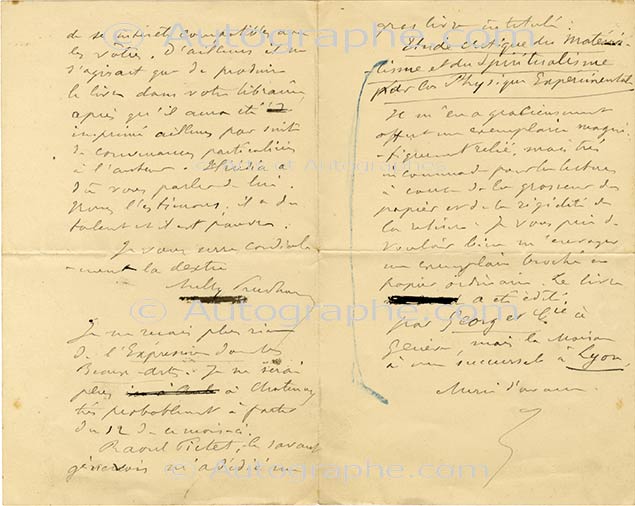 Lettre autographe signéeLettre autographe signée, adressée à un ami. Châtenay-Malabry, 7 août 1897 ; 3 pages in-12. « Philippe Dufour, lauréat du dernier concours de poésie à l’académie, projette la publication d’un recueil de ses meilleurs poésies....