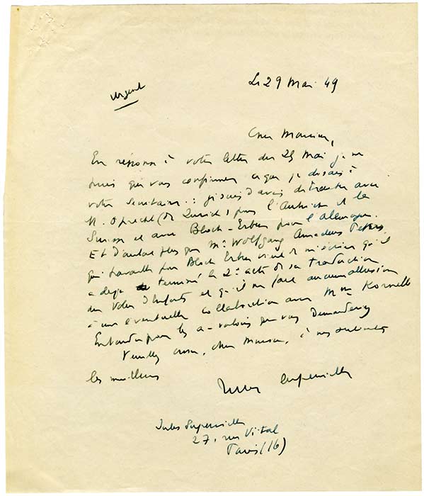 Lettre autographe signéeLettre autographe signée. 29 mai 1949 ; 1 page in-4°. « En réponse à votre lettre du 25 mai, je ne puis que vous confirmer ce que je disais à vote secrétaire : je suis d’avis de traiter avec M. Oprecht (de Zurich, puis...