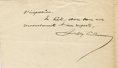 Lettre autographe signéeLettre autographe signée, adressée à une femme. Paris, 17 février 1898 ; 1 page 1/2 in-12, légère amorce de fente au pli. « Je prends la plus grande part à votre allégresse. […] La réparation de votre affreux malheur se fait peu...