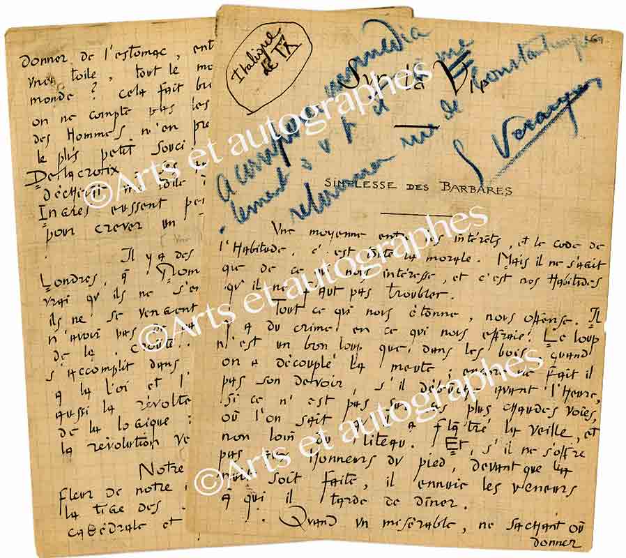 Manuscrit autographeManuscrit autographe intitulé « Sur la Vie — simplesse des Barbares ». Sans date ; 5 pages in-8°. « Une moyenne entre les intérêts et le code de l’habitude. C’est toute la morale. Mais il ne s’agit que de ce qui nous...