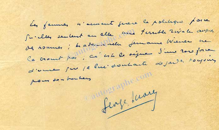 Pièce signéePièce signée. Sans date ; 1 page in-4°, oblongue. « Les femmes n’aiment guère la politique parce qu’elles sentent en elle une terrible rivale auprès des hommes ; Mademoiselle Germaine Wiener ne le croit pas ; c’est le signe...
