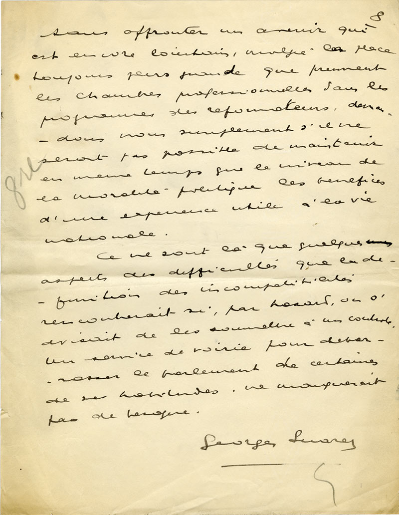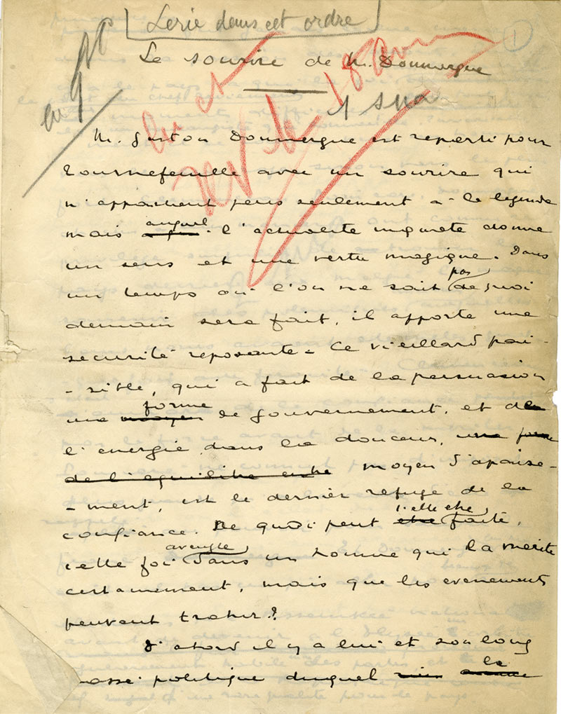Manuscrit autographe signéManuscrit autographe signé « Le sourire de M. Doumergue ». 8 pages in-4° ou in-folio, bordures un peu effrangées. Sans doute paru au Temps.« M. Gaston Doumergue est reparti pour Tournefeuille avec un sourire qui n’appartient pas...