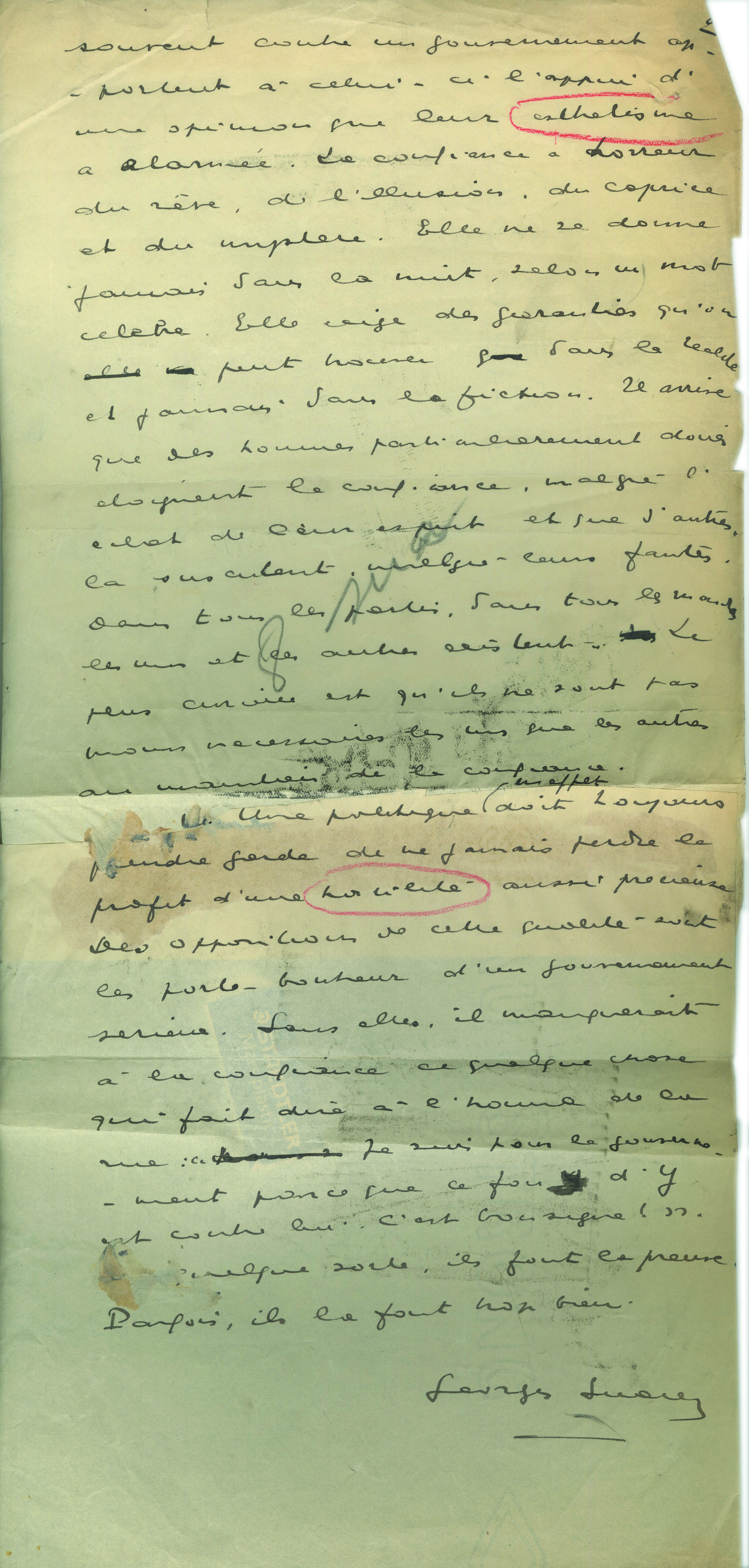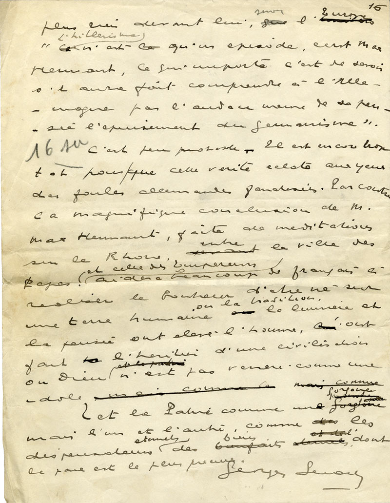 Manuscrit autographe signéManuscrit autographe signé « Idoles allemandes ». 16 pages in-4°. Sans doute paru au Temps.« Jamais le problème allemand n’est apparu au public français avec une forme aussi complète, sous un aspect aussi déroutant...