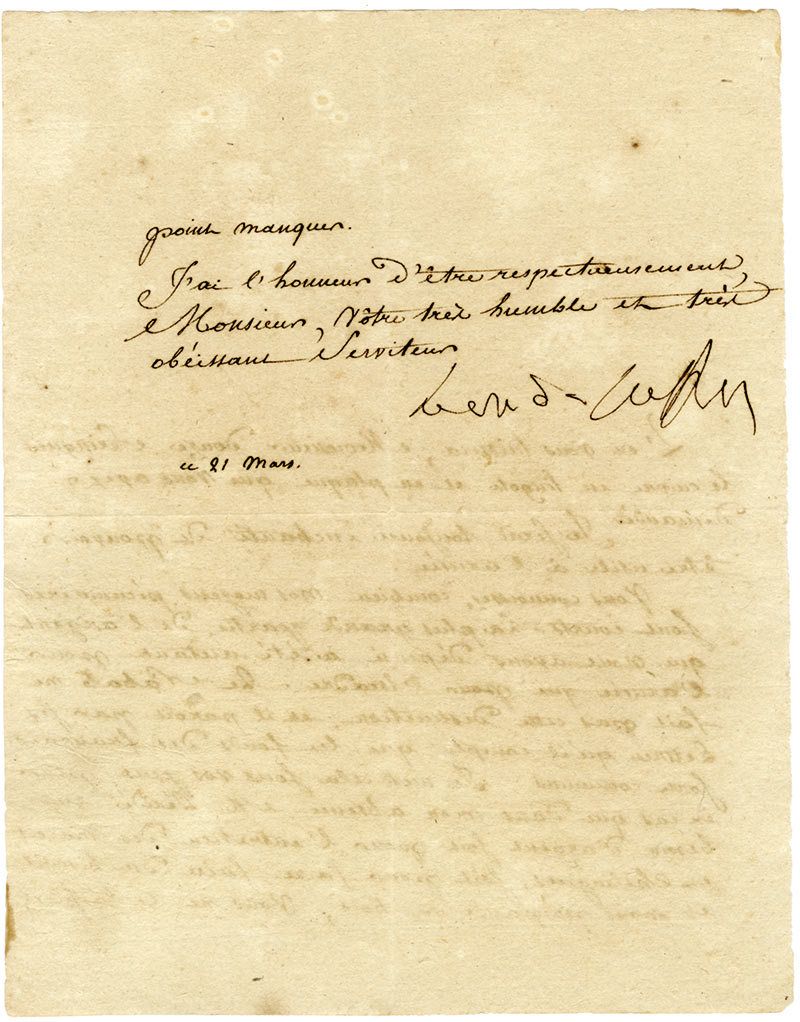 Lettre signéeLettre signée. « Ce 21 mars» [1782] ; 1 page 1/2 in-4°. « L’on vous laissera, Monsieur, douze seringues de cuivres en lingots et en plaques que vous avez demandées. Je serai toujours enchanté de pouvoir être utile à...