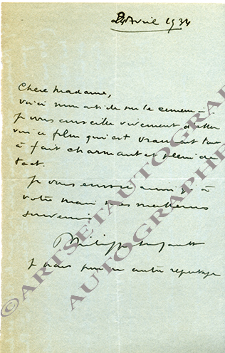 Lettre autographe signéeLettre autographe signée, adressée à Mme Georges Lubin. 24 avril 1934 ; 1 page in-12. Il lui envoie son article sur le cinéma. « Je vous conseille vivement d’aller voir ce film qui est vraiment tout à fait charmant et plein de tact....