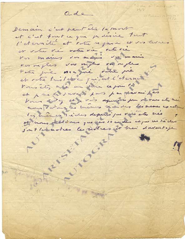 Manuscrit autographe signéPoème autographe « Ode », [publié dans Poèmes retrouvés (1918-1981). Ed. Lachenal et Ritter, 1982].[1968]; 1 page in-4°, pliure et déchirure en bas ne touchant pas le texte, réparée au dos. 15 vers à l’encre violette.«...