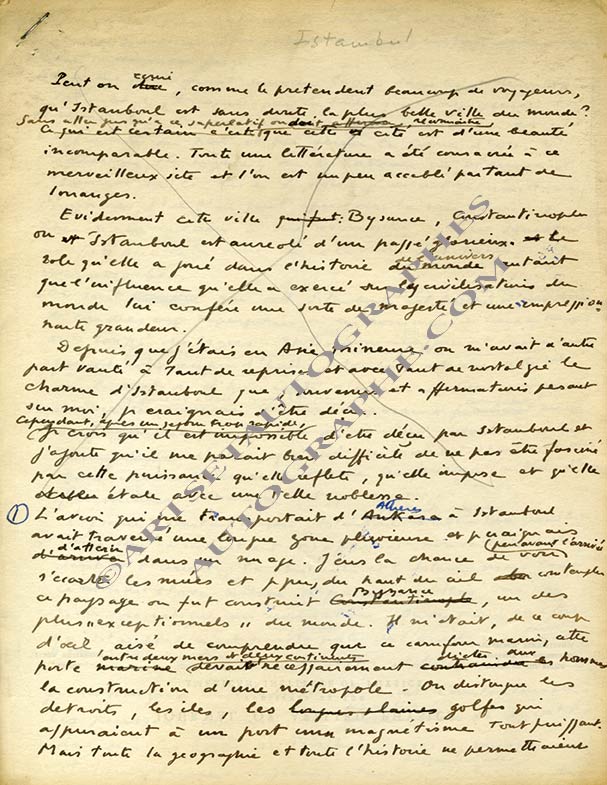 Manuscrit autographeManuscrit autographe « Istambul ». [Vers 1949] ; 4 pages in-4° avec ratures et corrections, au dos de feuillets à en-tête du « Journal of Applied Physics ».« Peut-on écrire, comme le prétendent beaucoup de voyageurs,...