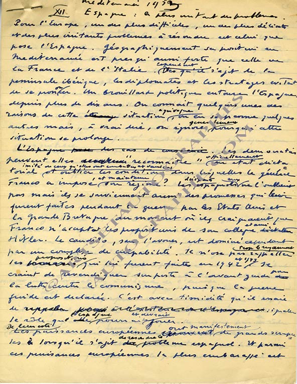 Manuscrit autographe signéManuscrit autographe, « Méditerranée 1953 ». 1953 ; 3 pages 1/4 in-4° avec ratures et corrections.« Espagne : le plus irritant des problèmes. Pour l’Europe, un des plus difficiles, un des plus délicats et des plus irritants des...