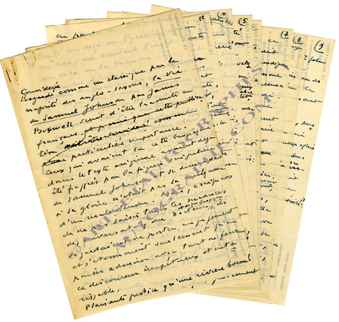 Manuscrit autographeManuscrit autographe [« Célébrité d’un sot »]. [1955] ; 9 pages in-8° avec ratures et corrections, au dos de feuillets à en-tête de l’UNESCO. Cet article sur la traduction française de la Vie de Samuel Johnson de James Boswell...