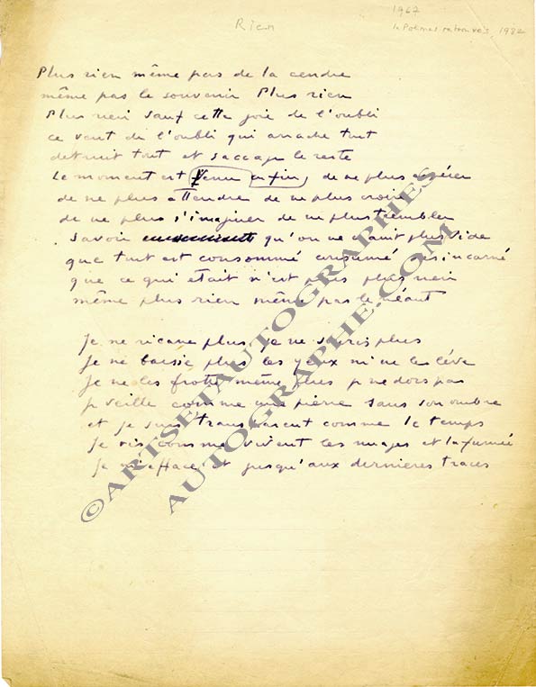 Manuscrit autographe signéPoème autographe « Rien », publié dans Poèmes retrouvés (1918-1981), Éditions Lachenal et Ritter, 1982.[1967] ; 1 page in-4°. 19 vers, avec quelques corrections.« Plus rien même pas de la cendremême pas le souvenir Plus...