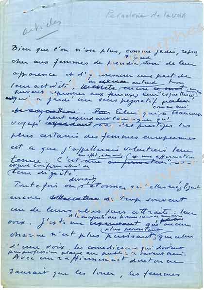 Manuscrit autographe signéManuscrit autographe. [Vers 1948-1953] ; 5 pages in-8°. « Bien que l’on n’ose plus, comme jadis, reprocher aux femmes de prendre grand soin de leur apparence et d’y consacrer une part de leur activité, on entend souvent reprocher...