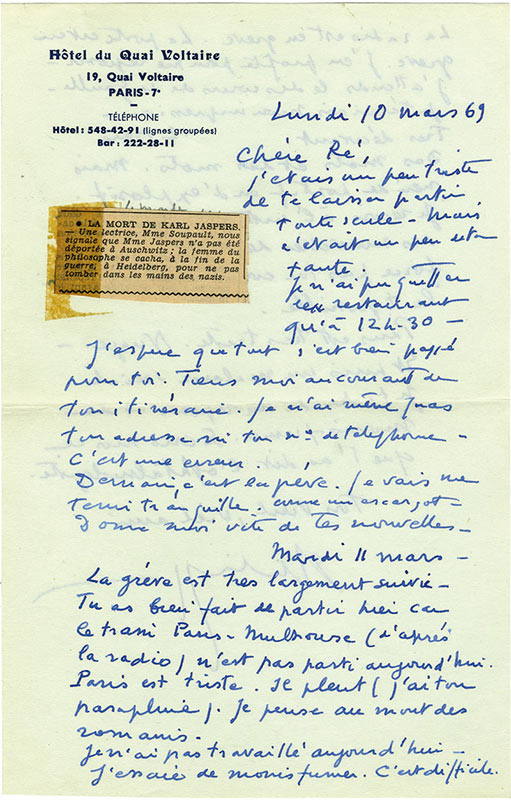 Lettre autographe signée, adressée à Ré Soupault.Lettre autographe signée, adressée à Ré Soupault. Paris, 10 mars 1969 ; 2 pages in-8°. En-tête de « L’hôtel du Quai Voltaire », enveloppe jointe. « Chère Ré, j’étais un peu triste de te laisser partir toute seule. Mais...