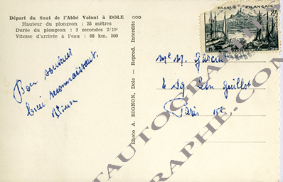Pièce signéeCarte postale illustrant ses exploits, signée par lui au dos. Carte ayant voyagée.