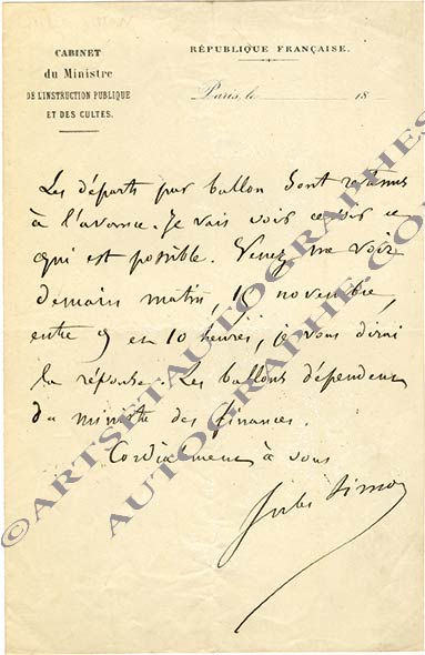 Lettre autographe signéeLettre autographe signée. [Paris, 14 novembre 1870] ; 1 page in-8°. « Les départs en ballons sont retenus à l’avance. Je vais voir ce soir ce qui est possible. Venez me voir demain matin, 15 novembre, entre 9 et 10 heures, je vous...