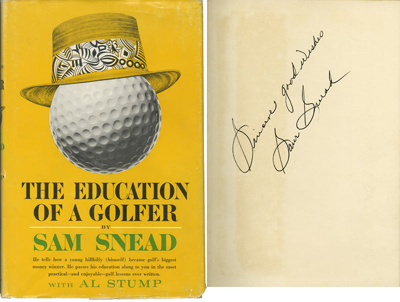 Envoi autographe signé« THE EDUCATION OF A GOLFER ». 1962 ; 24 x 16 cm. Éditions Simon and Schusters. Envoi autographe signé : « Sincere good wishes Sam Snead. »