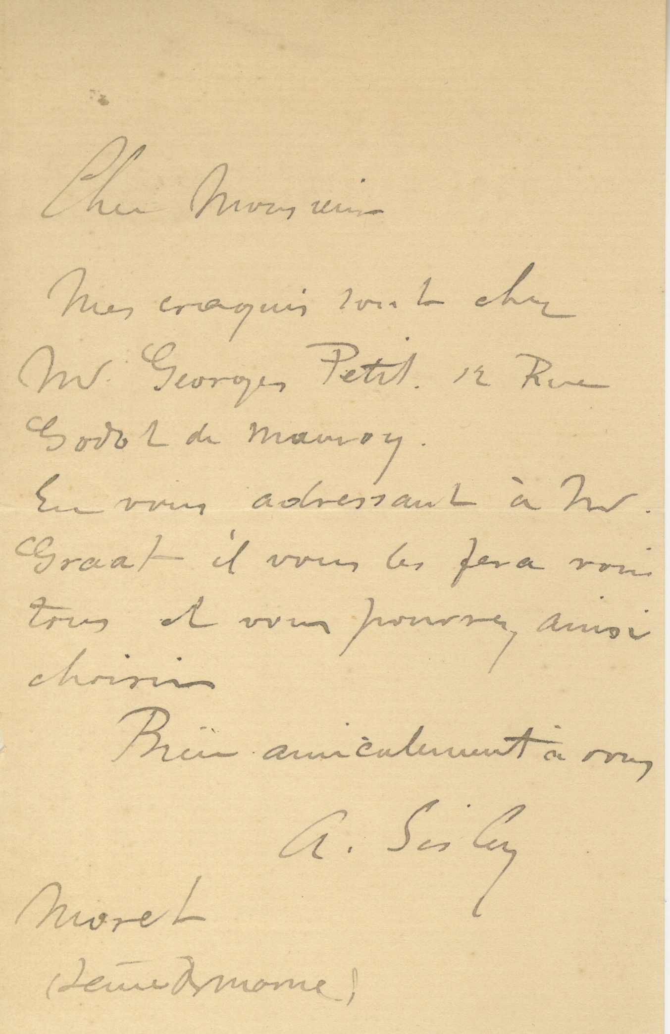 Lettre autographe signéeLettre autographe signée. Non datée, Moret ( Seine et Marne) ; 1 page in-12°. Lettre parlant de ses croquis. ...