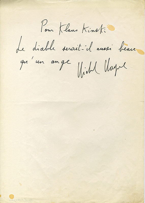 Pièce autographe signéePièce autographe signée. Sans date ; 1 page in-4°. Texte écrit pour le portrait de Kinski par Bruno de Mones.« Pour Klaus Kinski, Le diable serait-il aussi beau qu’un ange. »
