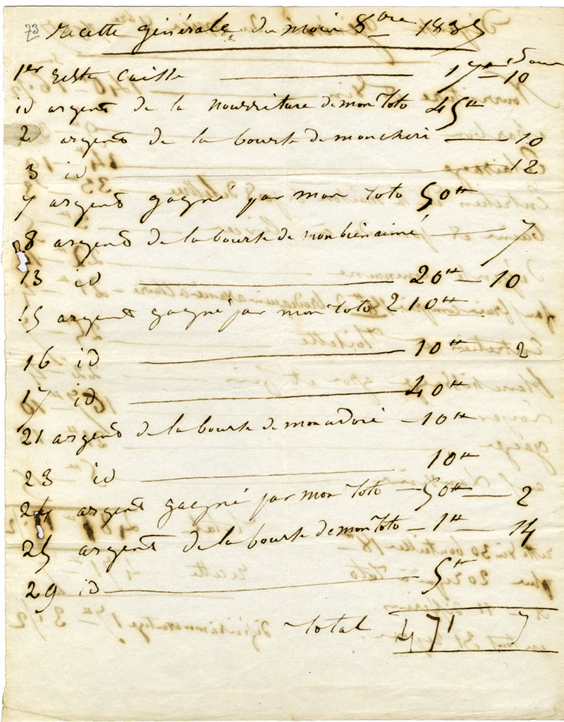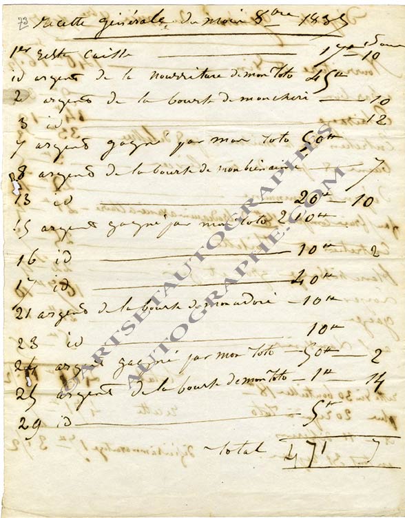Pièce autographePièce autographe. Octobre 1835 ; 2 pages in-4°, petits trous dans le papier dus à l’encre. Page de comptes du mois d’octobre 1835. « Recette générale du mois 8bre 1835 ». Juliette dresse la liste de ses dépenses et recettes, «...