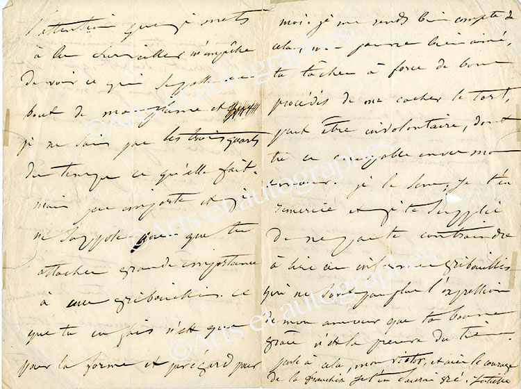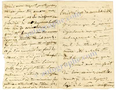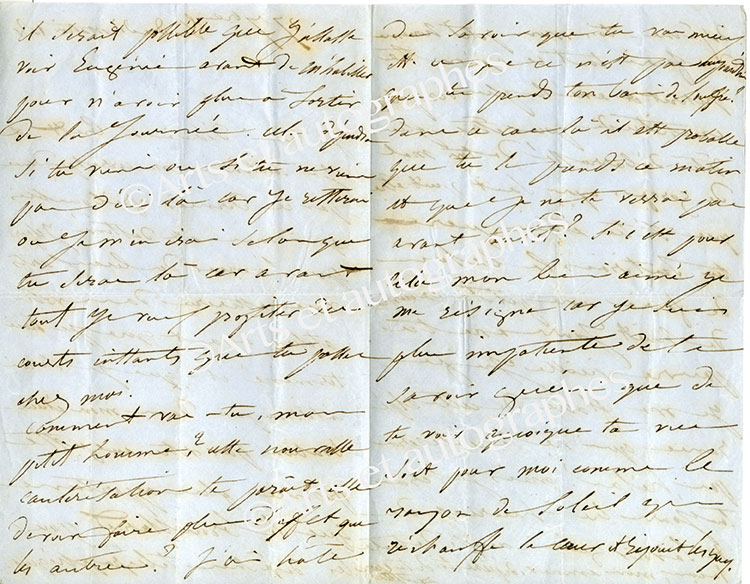 Belle lettre d'amour autographe signée, à Victor HugoTrès belle lettre d’amour autographe signée, adressée à Victor Hugo. « 28 avril (1849) samedi soir, 8 h » ; 4 pages in-8°. « Mon Dieu, est-ce que tu ne viendras pas ce soir ? Vraiment, j’en ai grand peur en regardant...