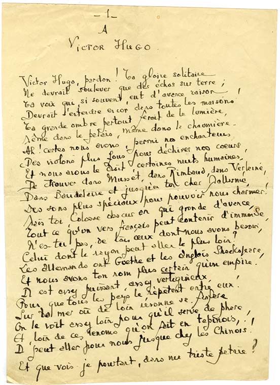 Manuscrit autographe signéManuscrit autographe en vers signé. Sans date ; 3 pages in-4°.« Victor Hugo, pardon ! Ta gloire solitaireNe devrait soulever que des échos sur terre ;Ta voix qui si souvent, eut d’avance raisonDevrais s’entendre encor dans...