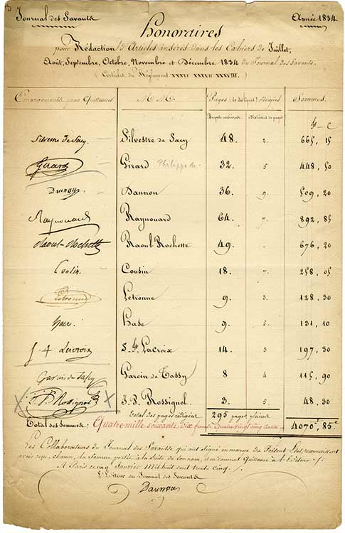 Feuille des honorairesFeuille des honoraires perçus pour rédaction d’articles dans les cahiers de juillet à décembre 1834 du Journal des Savants. 1834 ; 1 page in-folio. En marge des rédacteurs ont signé pour les quittances perçues : Silvestre de Sacy,...