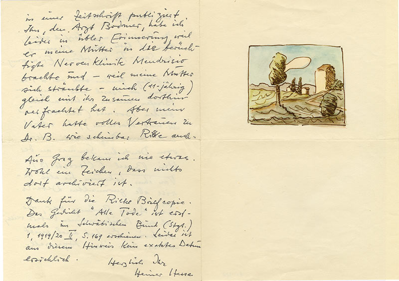 Lettre autographe signée de son filsLettre autographe signée de son fils, Heiner Hesse, adressée à Magda Weber. Vers 1970 ; 2 pages in-8°, en allemand, avec une reproduction en couleur d’un dessin de H. Hesse sur le 3e feuillet. « Zufällig fanden sich vor 2 Monaten in...