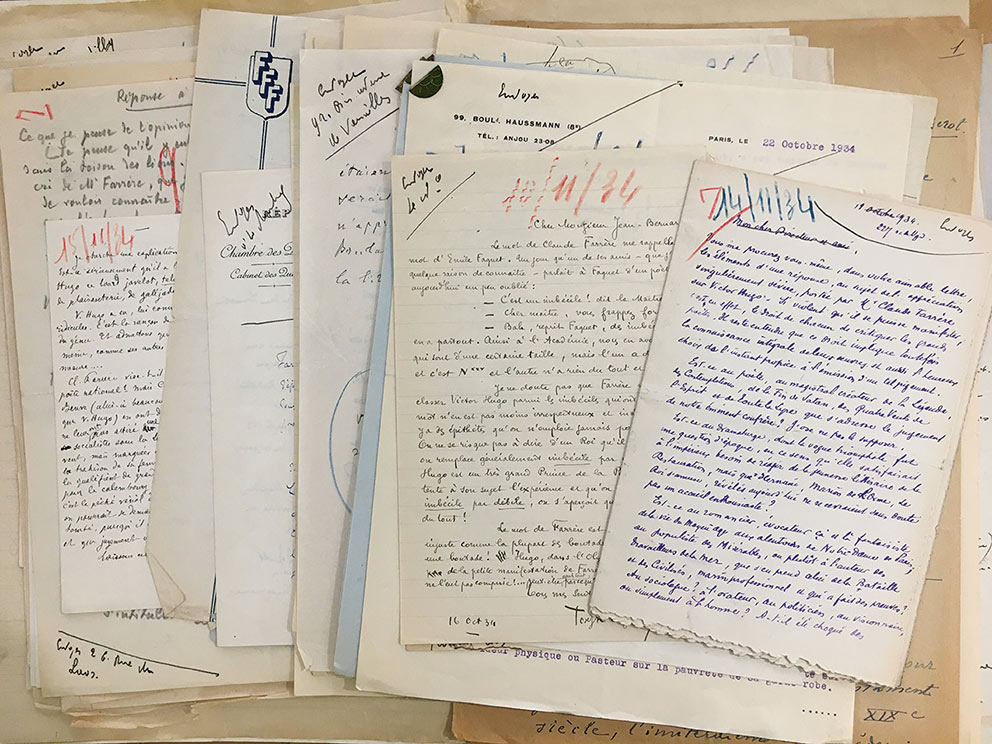 Ensemble de 63 lettres ou pièces, autographes signées en réponse à lenquête savoureuse sur une citation de Claude Farrère.Titre violemment gênant de Claude Farrère : « Victor Hugo le plus grand imbécile du XIXe siècle » (Claude Farrère). Octobre-novembre 1934. ...