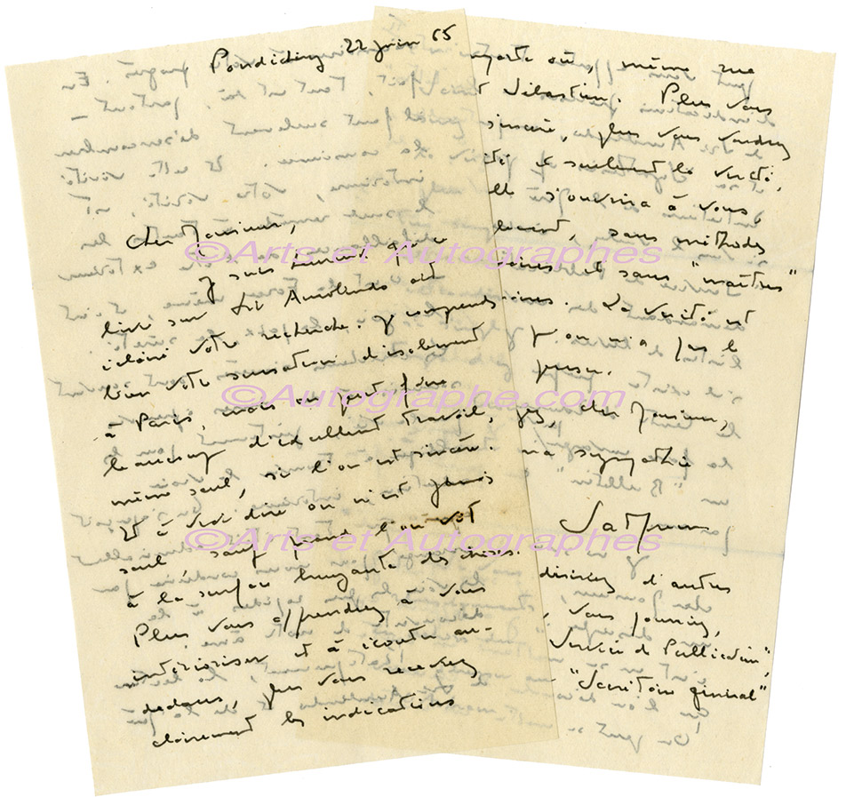 Lettre autographe signéeLettre autographe signée, adressée à M. Bak. Pondichéry, 22 juin 1965 ; 4 pages in-8°, enveloppe timbrée jointe. Il est heureux que son livre sur Sri Aurobindo lui plaise. « À vrai dire, on n’est jamais seul, sauf quand l’on est...