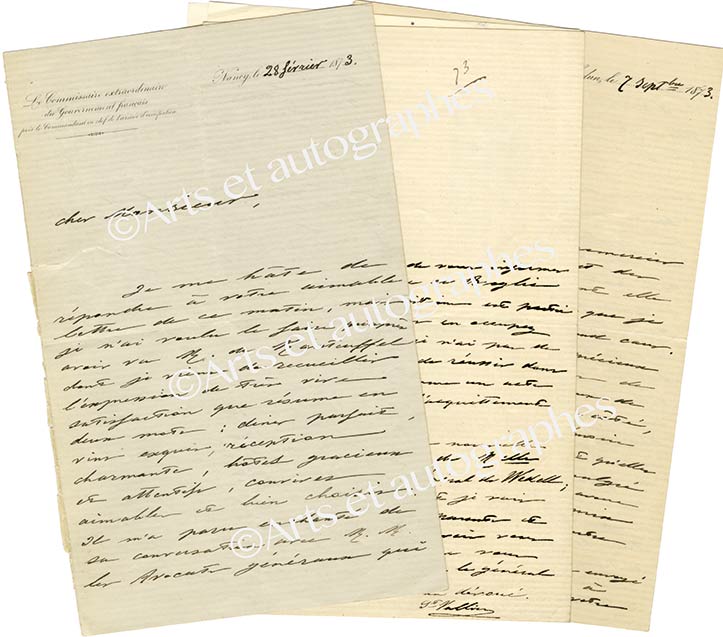 Ensemble de lettres autographes signées3 lettres autographes signées, adressées à M. Godelle. Février-septembre 1873 ; 8 pages in-8°. Il est beaucoup question dans ces lettres du général de Manteuffel dont les bons rapports avec M. Godelle favorisent la solution des...