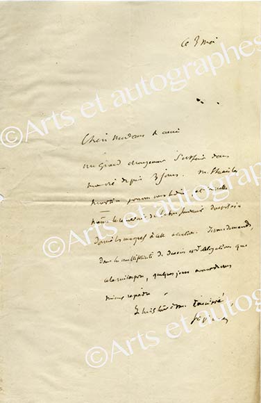 Lettre autographe signéeLettre autographe signée, adressée à Mme Desbornets. « Ce 3 mai » ; 1 page in-4°, enveloppe jointe. Au sujet du décret de l’Empereur, qui élève Sainte-Beuve, membre de l’Académie Française à la dignité de sénateur. « Un...