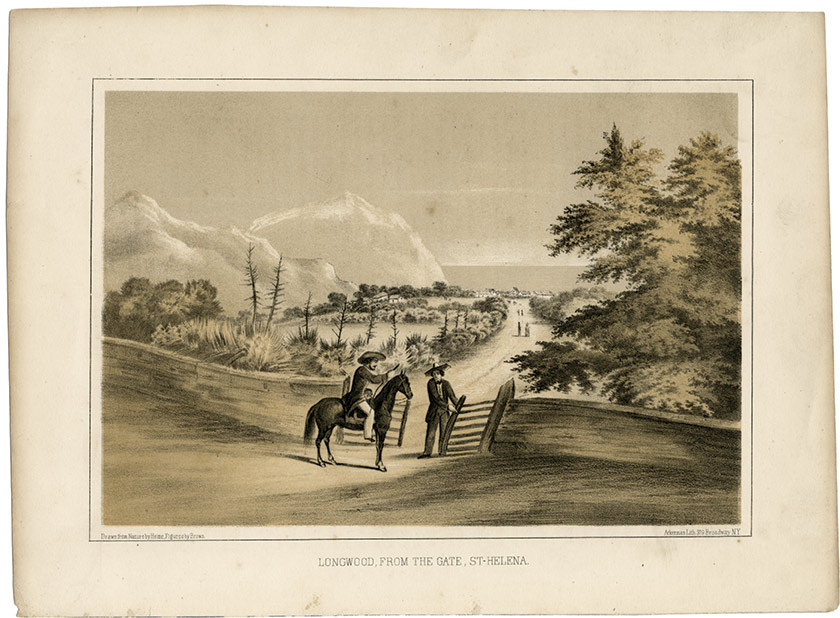 Gravure américaine ancienne montrant une vue de Longwood.Gravure américaine ancienne montrant une vue de Longwood. « Longwood, from the gate, St-Helena ». XIXe siècle ; 21,5 cm x 29 cm. « Drawn from Nature by Heine, Figures by Brown ». Lithographie imprimée à New York.