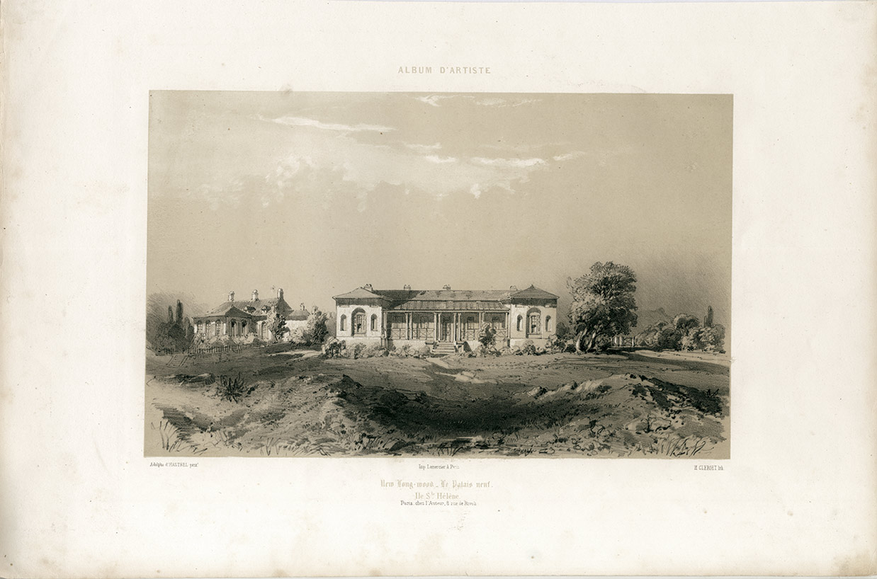 Gravure ancienne montrant une vue du New Longwood.Gravure ancienne montrant une vue du New Longwood. Lithographie de H. Clerget d'après une peinture d'Adolphe d'Hastrel. XIXe siècle ; 28,5 cm x 44 cm....