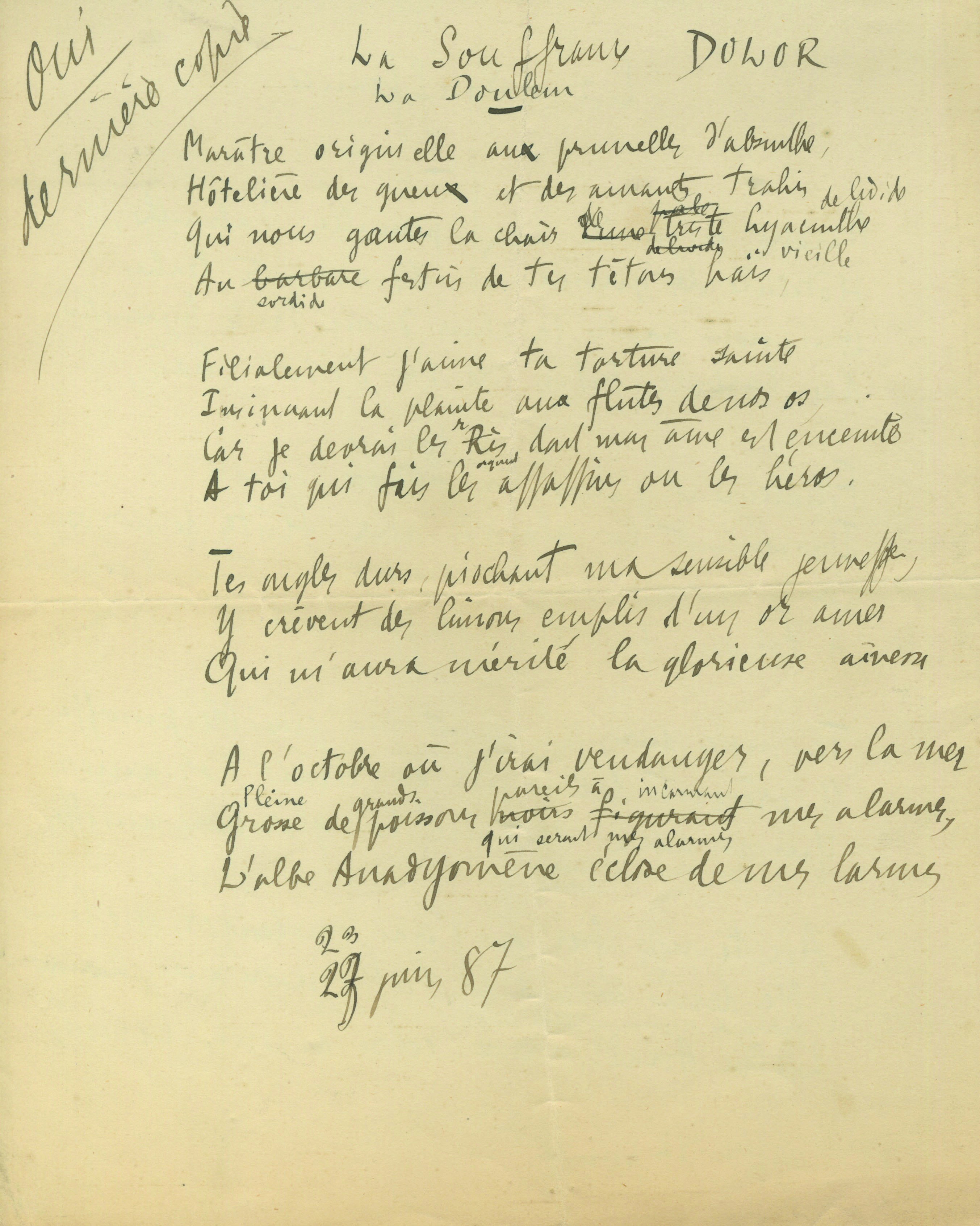 Poème autographePoème autographe. 1887 ; 1 page petit in-4°. La Souffrance, sonnet irrégulier, est en deux versions : la première, datée 17 juin 1887, avec ratures et corrections, est biffée ; au verso, une « dernière copie », également...